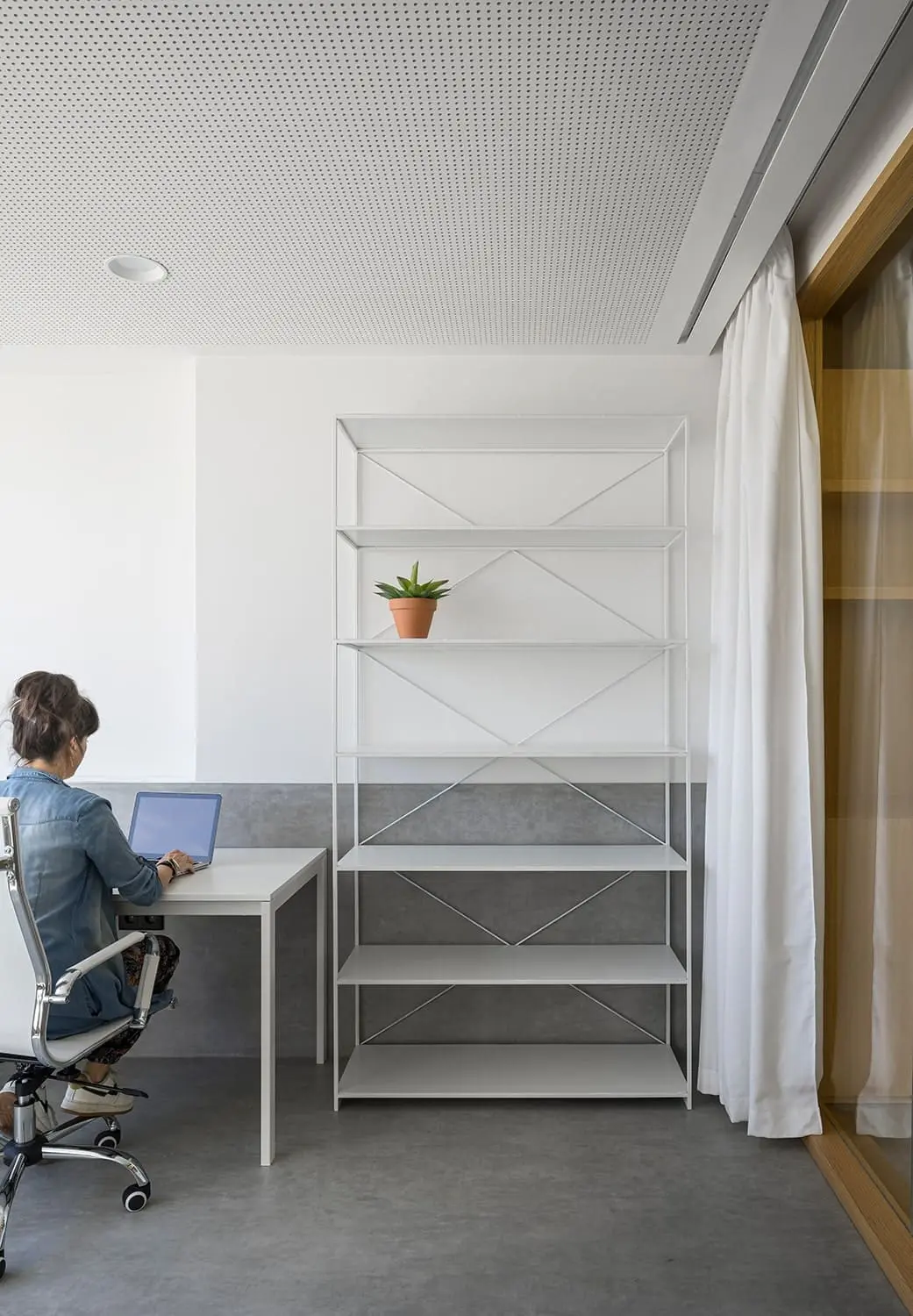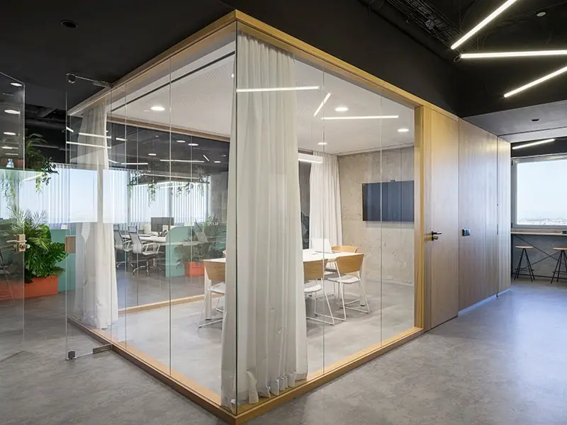Oficina con pared de cristal y cortina