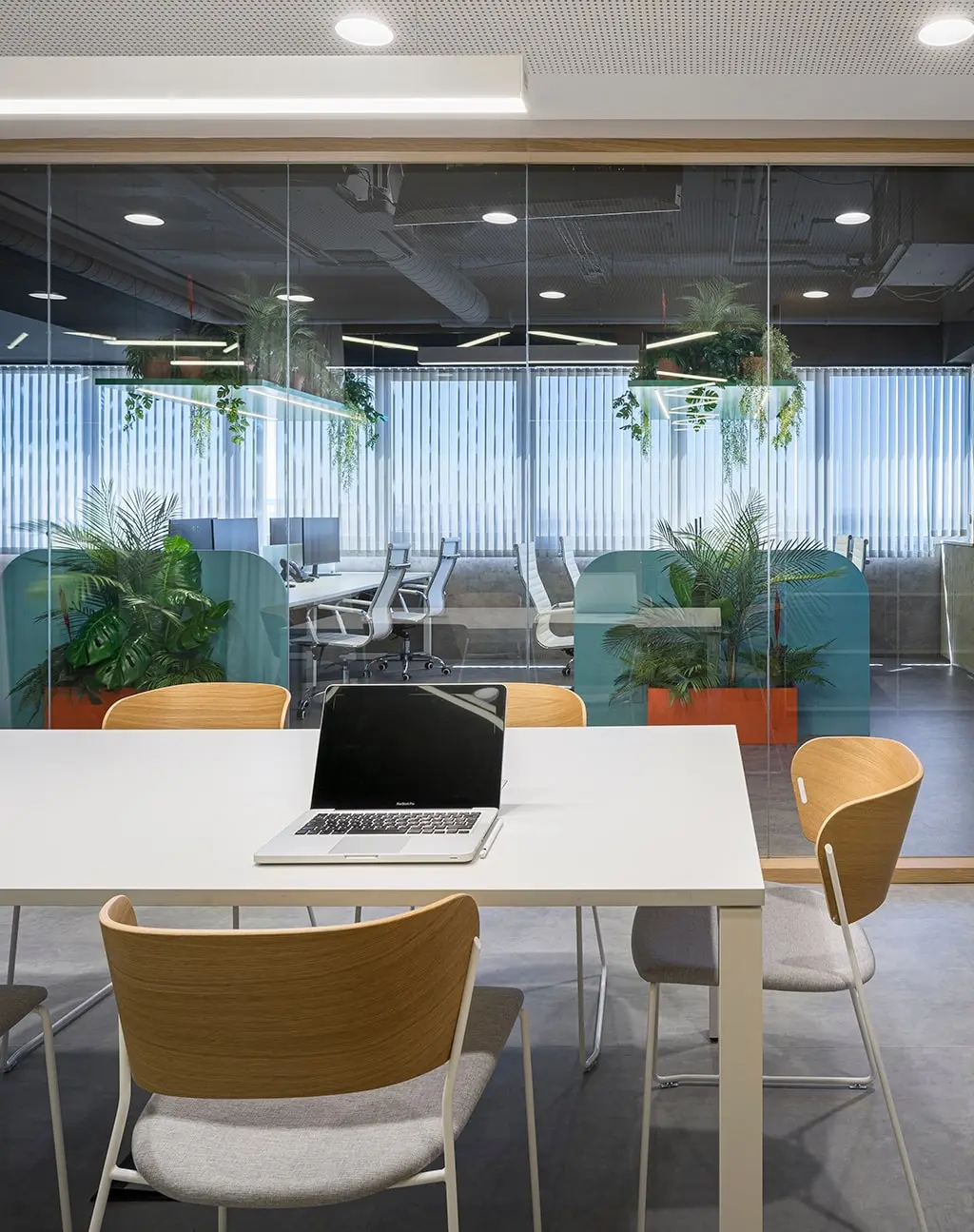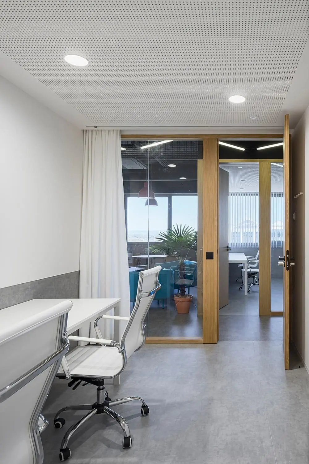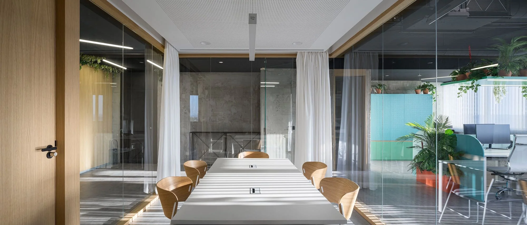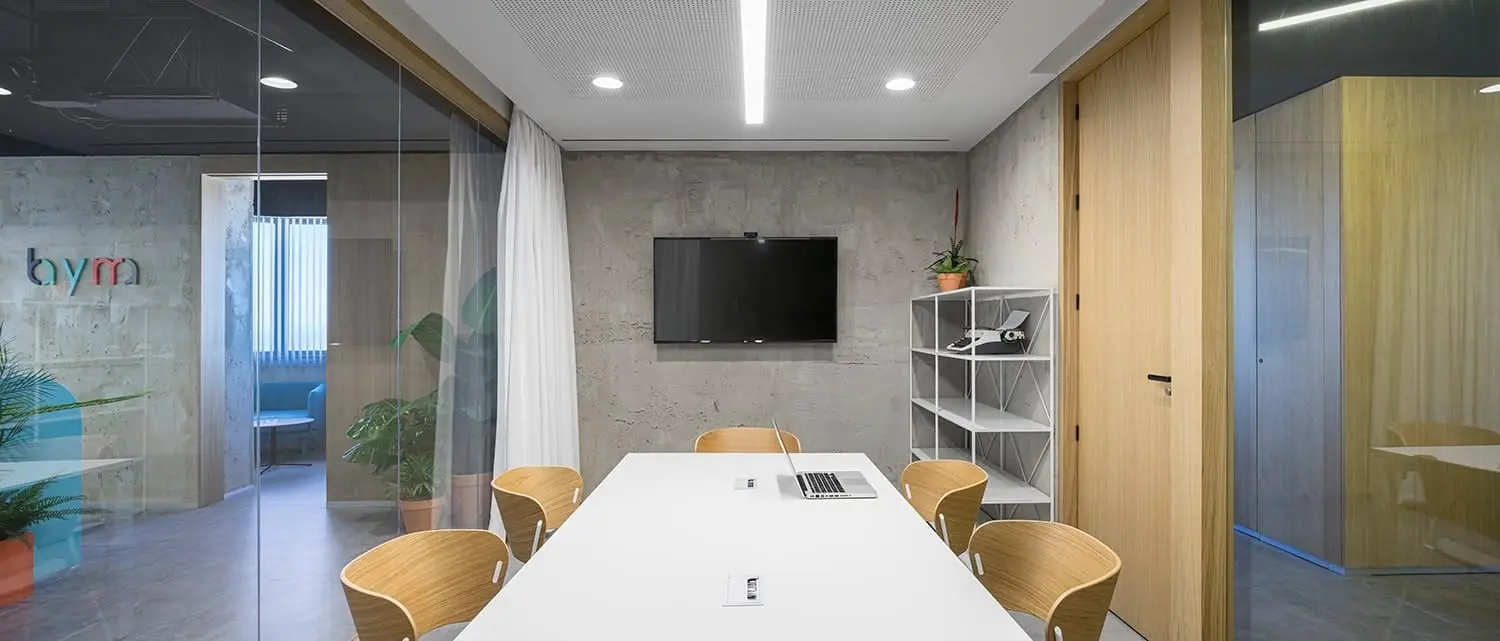 Vista desde fuera de la sala de reuniones en BySpaces Coworking, Sevilla, con paredes de cristal y cortinas para control de privacidad y luz natural.
