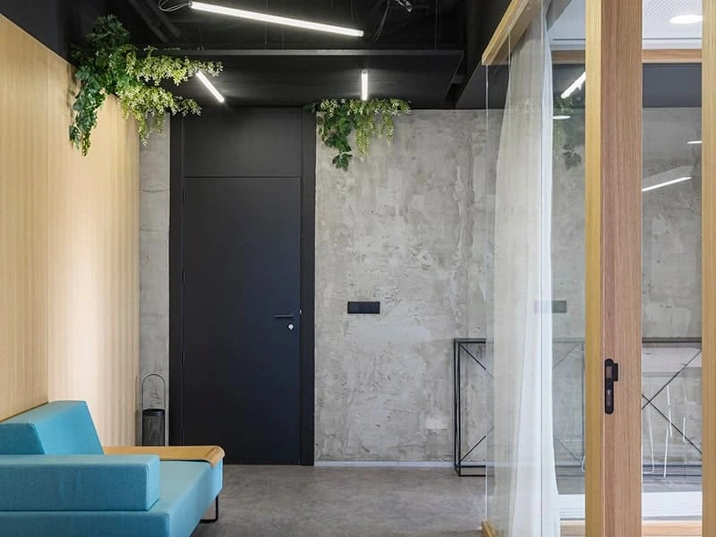 Diseño industrial con pasillos modernos en BySpaces Coworking, Sevilla, con suelos y techos industriales, madera clara para marcos y puertas.