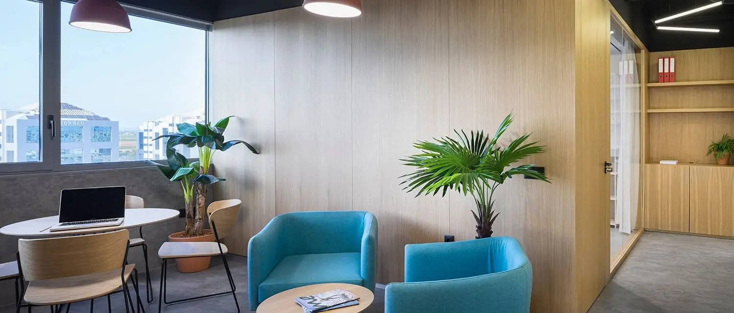 Interior de una oficina en BySpaces Coworking, Sevilla, diseñada para hasta 4 puestos de trabajo.
